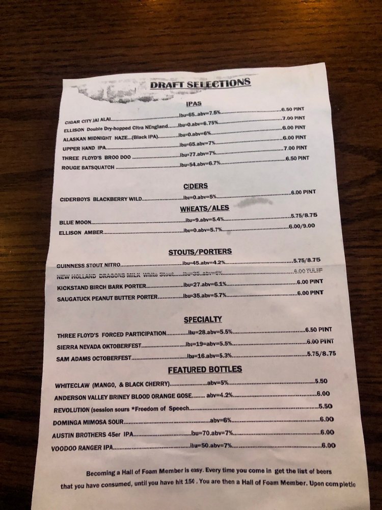 Appetizers Red Wine Bottled Domestics Ipa Bottled Beers From Around The World Draft Beer Seltzers Burgers Signature Cocktails Others Handhelds Monday Wheat Hefeweizen Fruit Beer Brown Ale Cider Strong Ales Specialty Styles Detroit Style Pizza Beverages Entrees Wednesday Junior Club Desserts Soup & Salads Thursday Draft Selections Cider, Stout/Porter Features Wheats/Ambers/Lagers/Ales